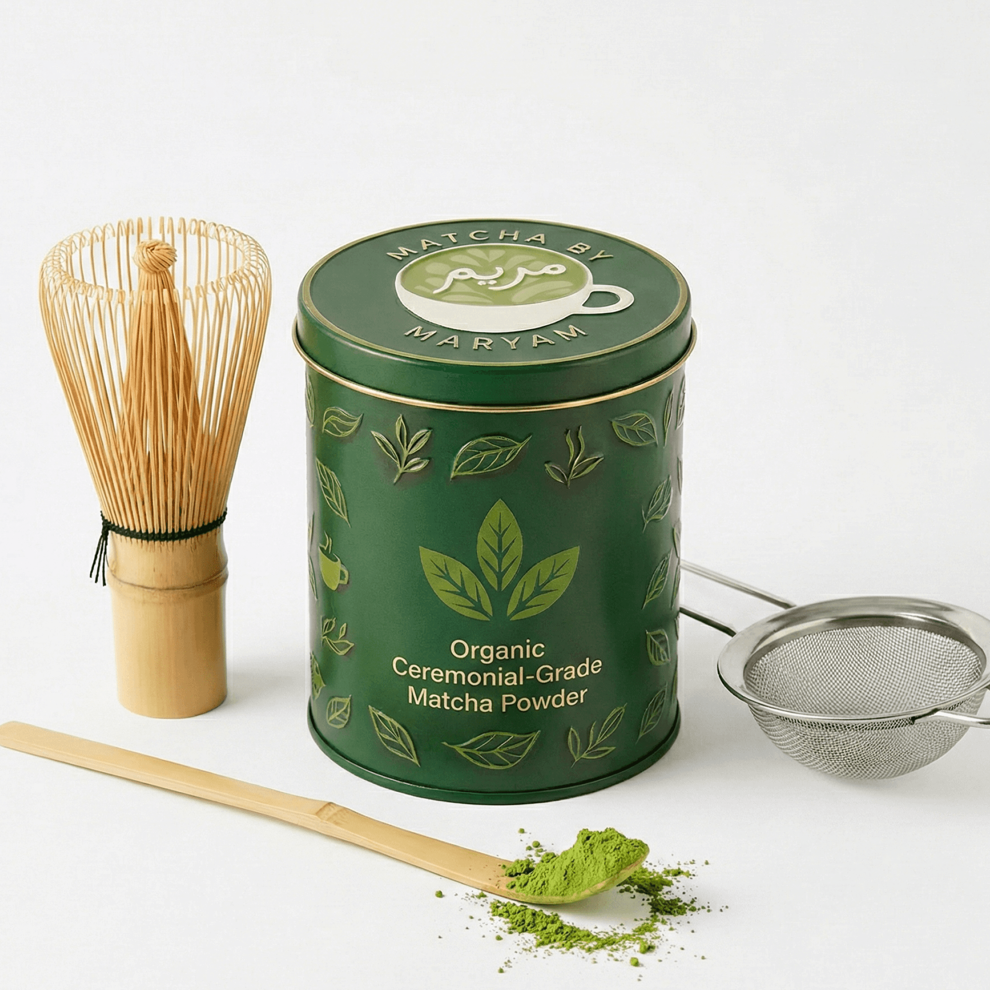 Ceremonial-grade matcha powder, bamboo whisk, stainless steel sifter, bamboo spoon.